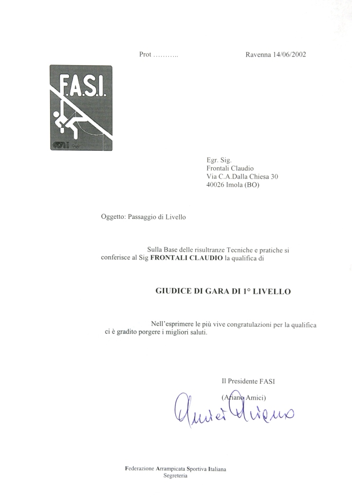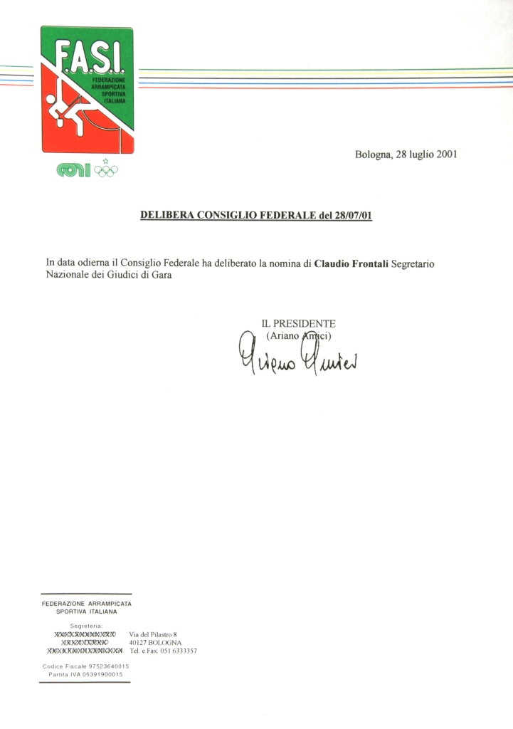 Negli anni tra il 2001 e il 2005, ha ricoperto l'incarico di Segretario nazionale dei Giudici Federali Italiani all'interno dell'organigramma della F.A.S.I., Federazione Arrampicata Sportiva Italiana, espletando il ruolo di "Designatore Arbitrale" all'interno della Federazione.
